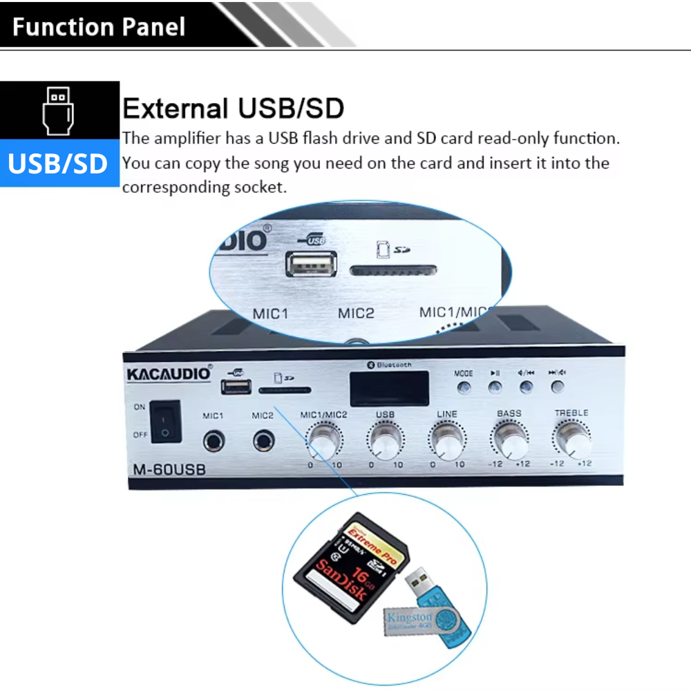 Amply 60W Kacaudio USB-60 công suất 60W tích hợp Bluetooth, USB, thẻ nhớ. Hỗ trợ 2 mic, chỉnh bass treble, dùng cho quán cafe, spa, nhà hàng, văn phòng.