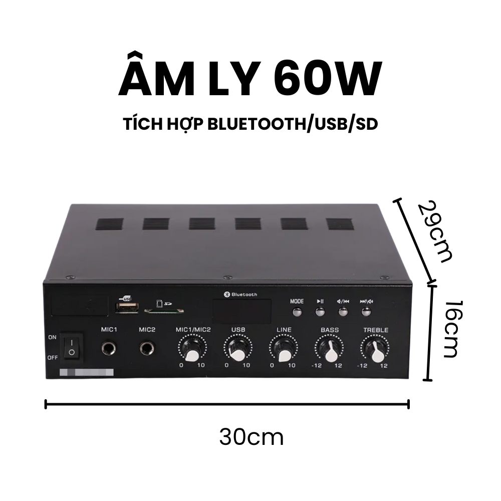 Amply 60W Kacaudio USB-60 công suất 60W tích hợp Bluetooth, USB, thẻ nhớ. Hỗ trợ 2 mic, chỉnh bass treble, dùng cho quán cafe, spa, nhà hàng, văn phòng.