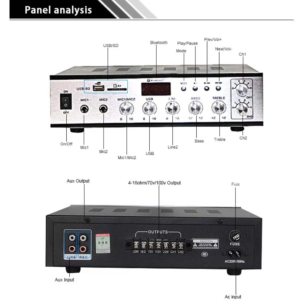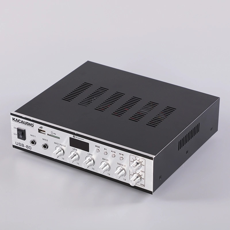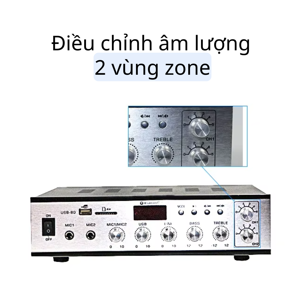 Kacaudio M-80USB là mẫu amply đa năng, công suất 80W, tích hợp khả năng phát nhạc từ Bluetooth, USB, thẻ nhớ SD và radio FM. Đặc biệt, thiết bị hỗ trợ 2 vùng âm thanh độc lập (2 zone) với núm điều chỉnh âm lượng riêng, giúp bạn dễ dàng phát nhạc hoặc thông báo cho từng khu vực.