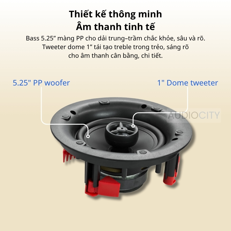 - Âm thanh Hi-Fi 2 đường tiếng: Cấu tạo gồm củ loa Woofer 5.25 inch và Tweeter 25mm, tái tạo dải âm từ trầm ấm đến cao vút một cách trung thực.
