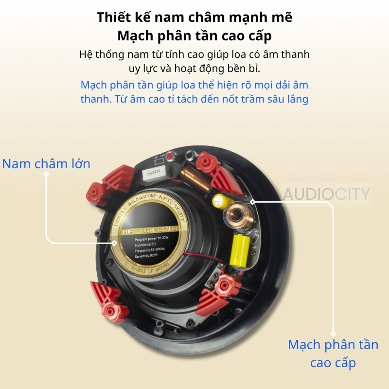 - Thiết kế Frameless đẳng cấp: Mặt lưới từ tính siêu mỏng, không viền, giúp loa bám sát mặt trần thạch cao, mang lại vẻ đẹp tối giản và thẩm mỹ tuyệt đối.
