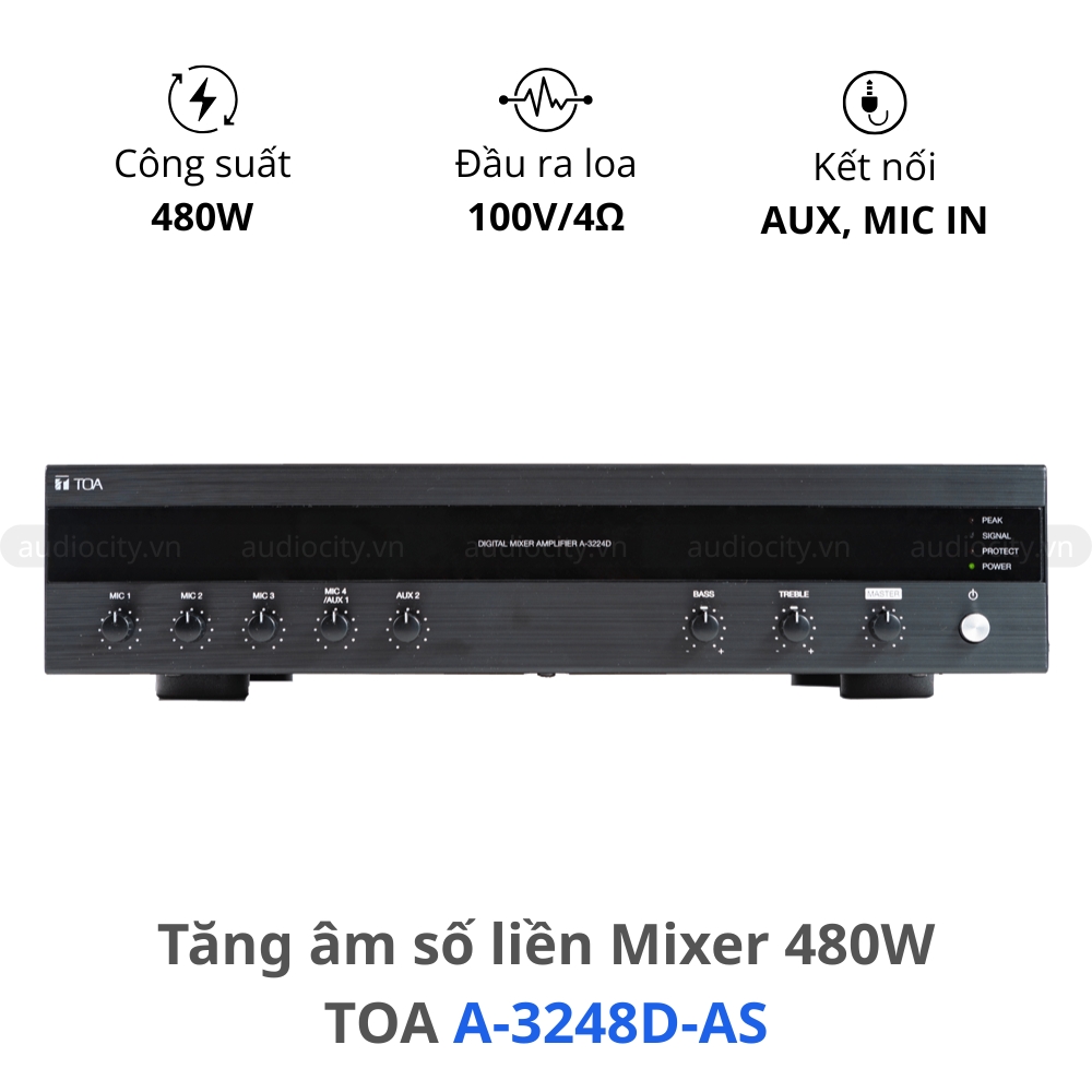 TOA A-3248D-AS là tăng âm số liền mixer 480W, hỗ trợ nhiều ngõ mic/AUX, phantom mic, chọn đầu ra 100V/4Ω, phù hợp âm thanh thông báo & nhạc nền không gian lớn.